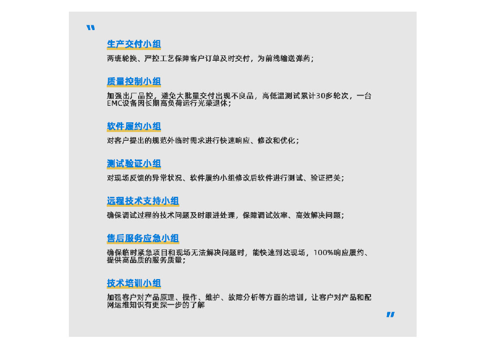 以“通過5+2區(qū)域所有地市的入網(wǎng)檢測、一級重點保障區(qū)域服務(wù)響應(yīng)率100%(廣州服務(wù)響應(yīng)0投訴)”為工作目標(biāo),總經(jīng)理親自掛帥,制造部、電網(wǎng)產(chǎn)品部、電網(wǎng)技術(shù)管理部、電網(wǎng)技術(shù)服務(wù)部、電網(wǎng)市場部、體系辦、中試部、測試部共同參與的行動一觸即發(fā),多個專項工作組立刻高速運轉(zhuǎn):