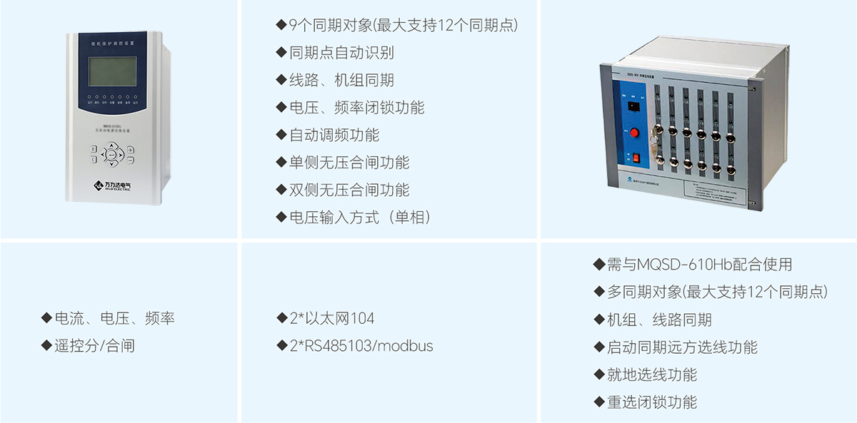 MQSD-810Hc自動準同期裝置是為了實現水、火電廠(站)等多種同步發電機組或線路的快速、準確并網而專門設計的智能裝置。該裝置既可以進行同期操作,也可以實現線路開關的無壓合閘操作;既可適用于單一類型的同期對象(如電廠機組開關),也可適用于多種類型同期對象共存的情況(與本公司QSDS-30X選線裝置配合)。