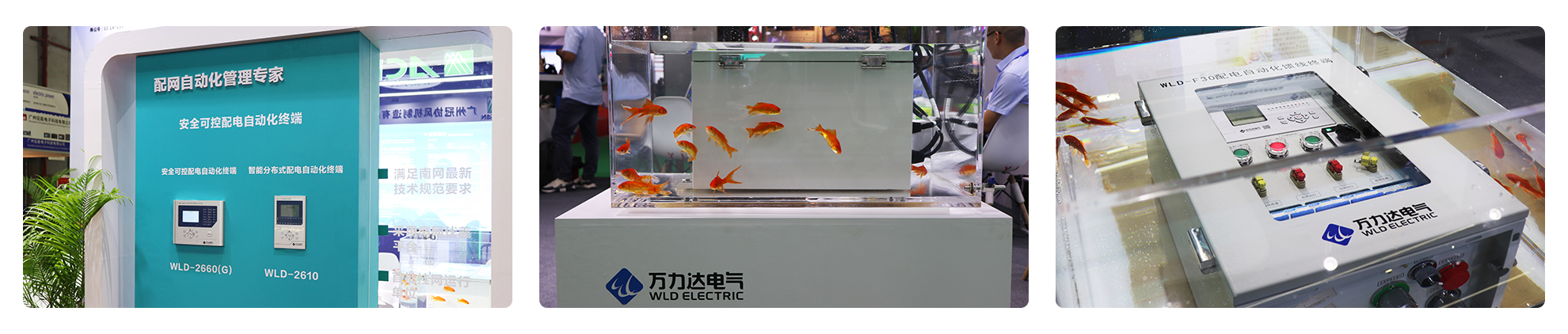 “這是我們自研自產的FTU,有不同防護等級可選,水箱里展示的這款是IP67的,可以看到,水下浸泡著也依然可以正常操作……”,技術人員在一旁解說道。