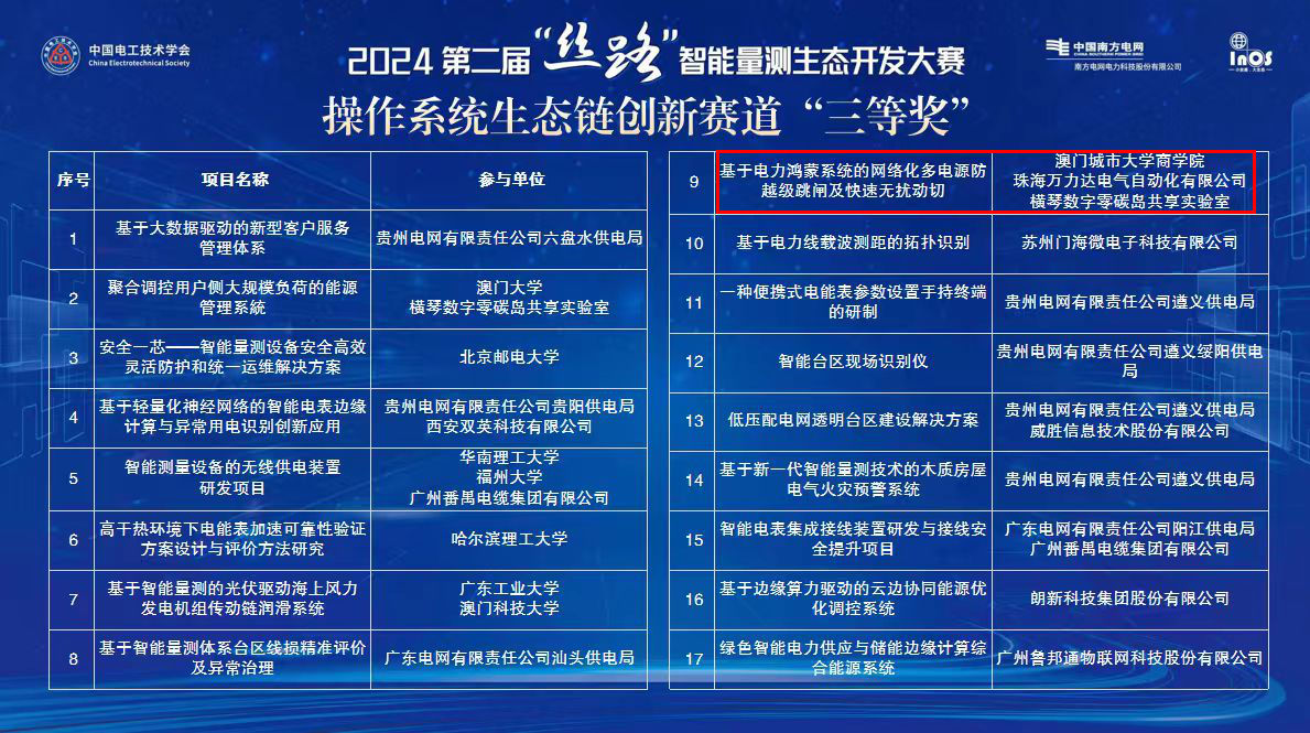 20241123日,珠海萬力達電氣技術股份有限公司與澳門城市大學商學院、橫琴數字零碳島共享實驗室聯手參賽,以基于電力鴻蒙系統的網絡化多電源防越級跳閘及快速無擾動切換為主題的創新作品,在中國電工技術學會主辦的2024第二屆中國電氣工程大會暨展覽會及絲路智能量測生態開發大賽中,憑借卓越的創新實力和技術優勢,從眾多參賽隊伍中脫穎而出,榮獲操作系統生態鏈創新賽道三等獎。這是公司在國家級科技賽事中的重大突破,也是對公司長期堅持技術創新與產學研深度合作的高度肯定。