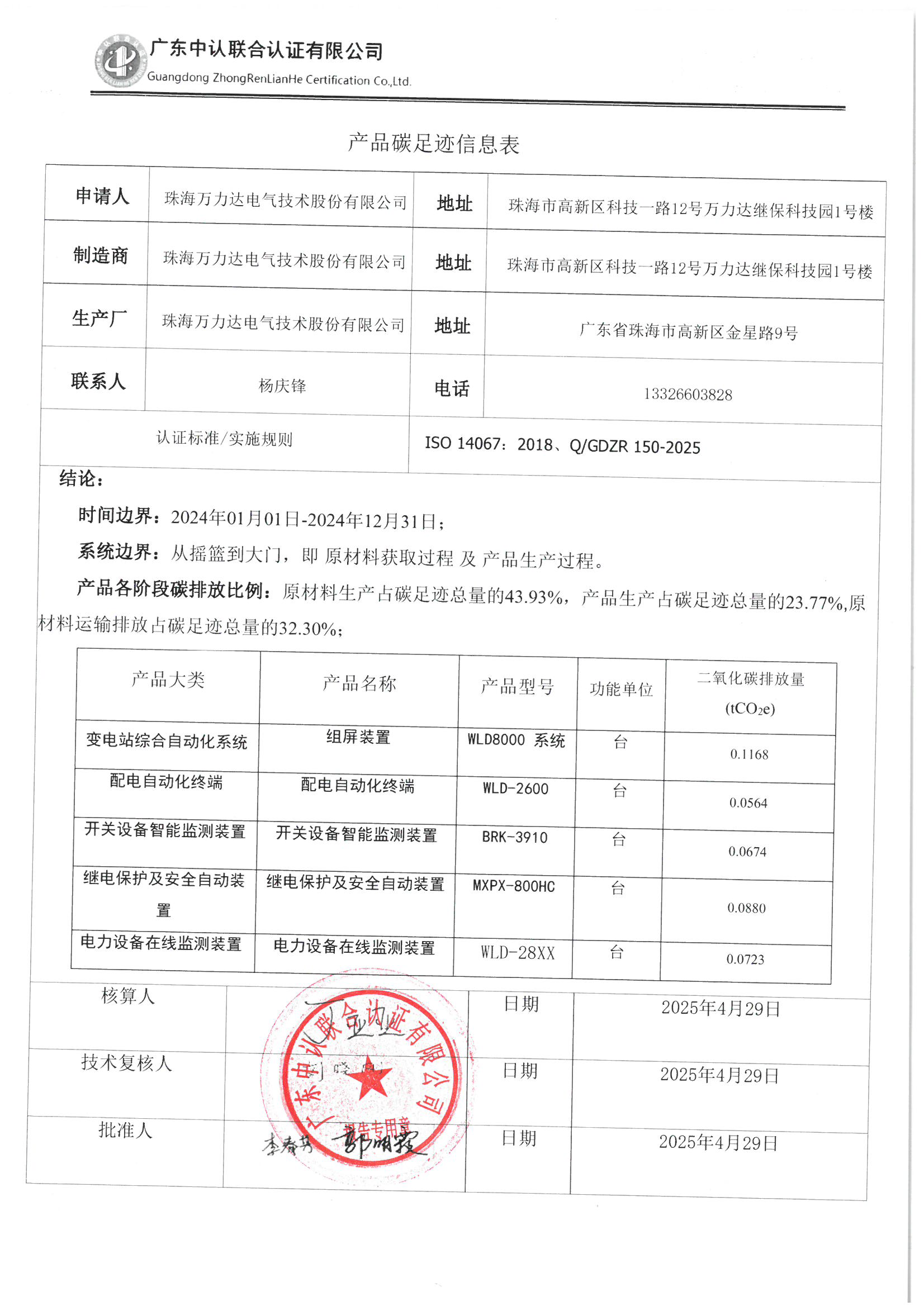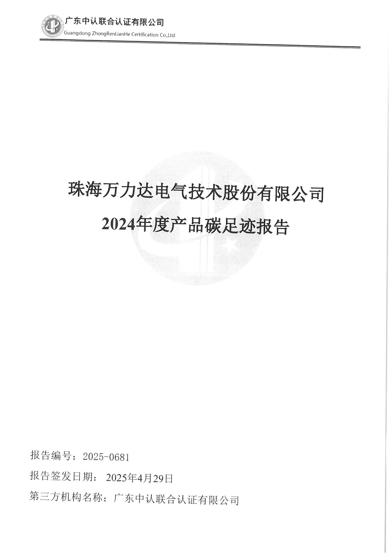 珠海萬力達電氣技術股份有限公司2024年度產品碳足跡報告公示